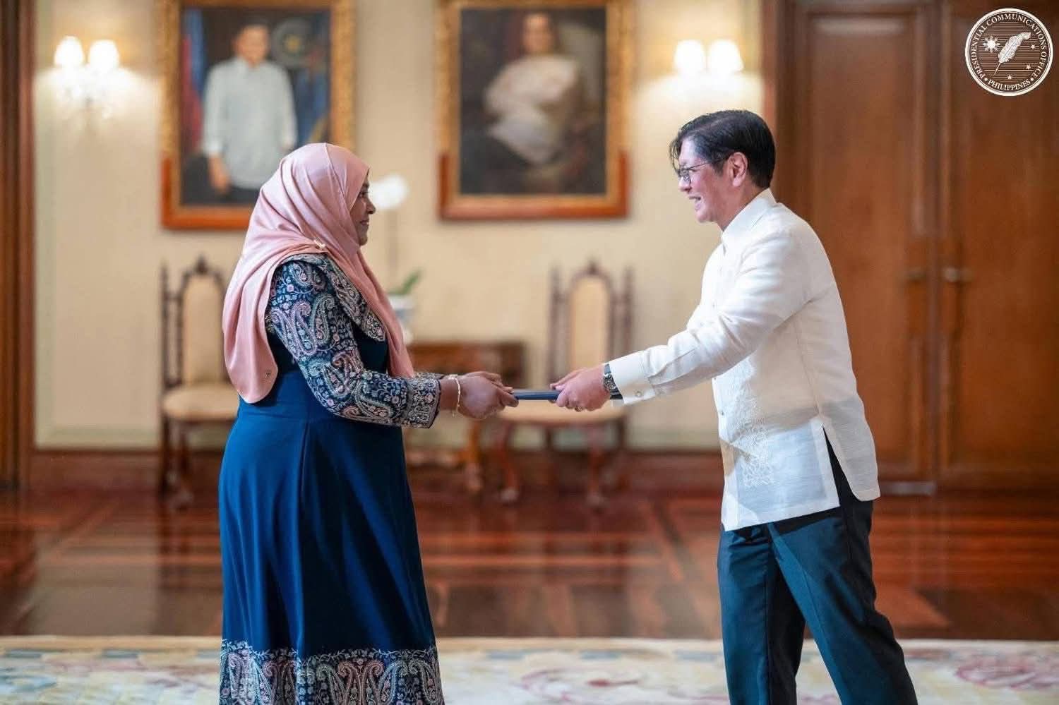 ދިވެހިރާއްޖެއިން ފިލިޕީންސަށް ކަނޑައެޅުއްވި ސަފީރު ޑރ. މަރިޔަމް ޝަބީނާ އަޙްމަދު، އެކަމަނާގެ ސަފީރުކަމުގެ ފަތްކޮޅު ފިލިޕީންސްގެ ރައީސް ފަރޑިނެންޑް އާރް.މާރކޮސް ޖޫނިއަރއަށް އަރުވައިފިއެވެ.