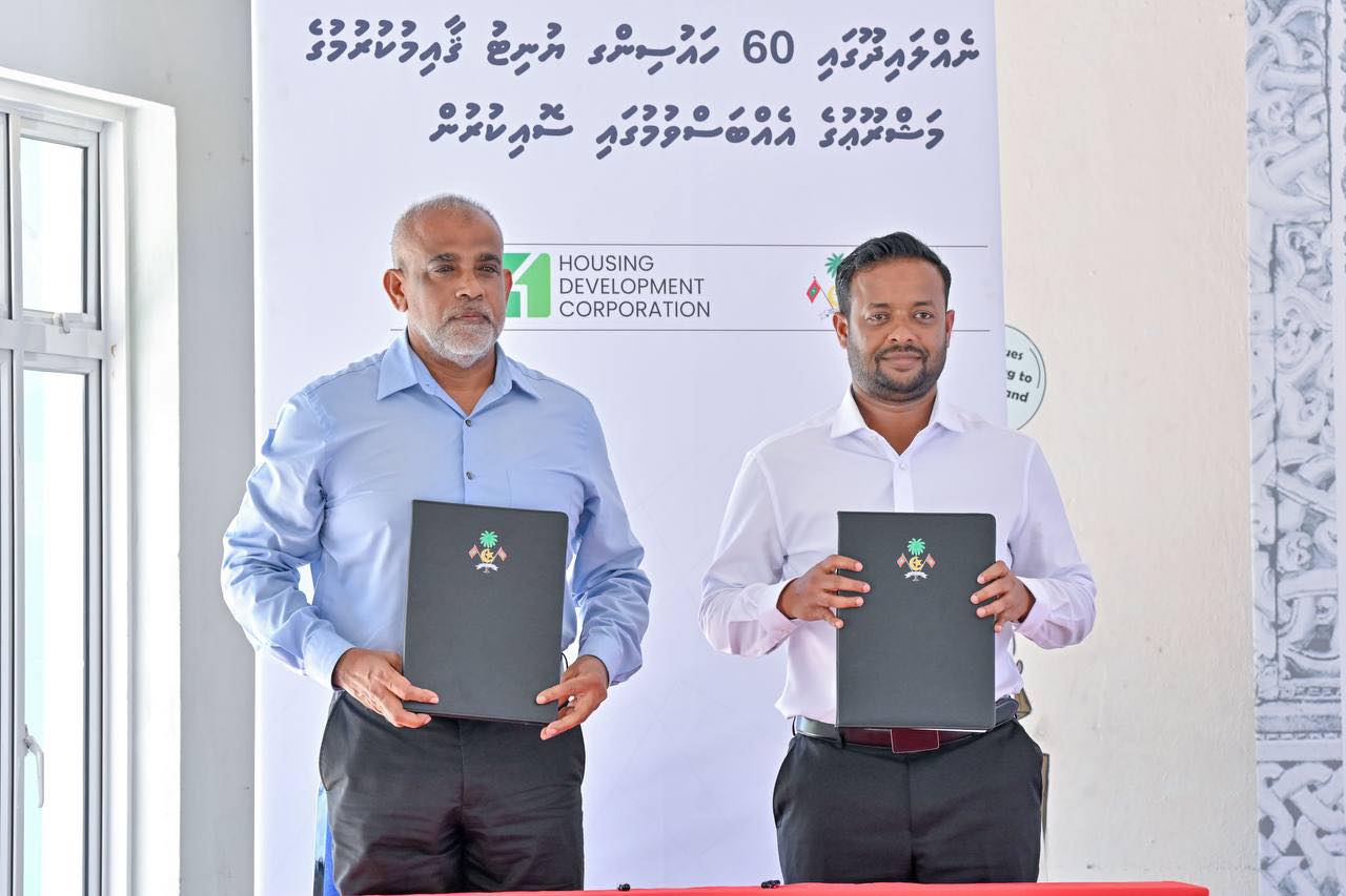 60 ހައުސިން ޔުނިޓް ތަރައްޤީކުރުމުގެ އެއްބަސްވުމުގައި އިމާރާތްކުރުމާއި ގެދޮރުވެރިކަމާއި ބިނާރާ ބެހޭ ވުޒާރާގެ ފަރާތުން ސޮއިކުރެއްވީ ވަޒީރު ޑރ.ޢަބްދުﷲ މުއްޠަލިބެވެ. އެޗްޑީސީގެ ފަރާތުން ސޮއިކުރެއްވީ މެނޭޖިންގް ޑިރެކްޓަރ (ރިޓަޔާރޑް) ބްރިގޭޑިއާ ޖެނެރަލް އަލީ ޒުހެއިރެވެ.
