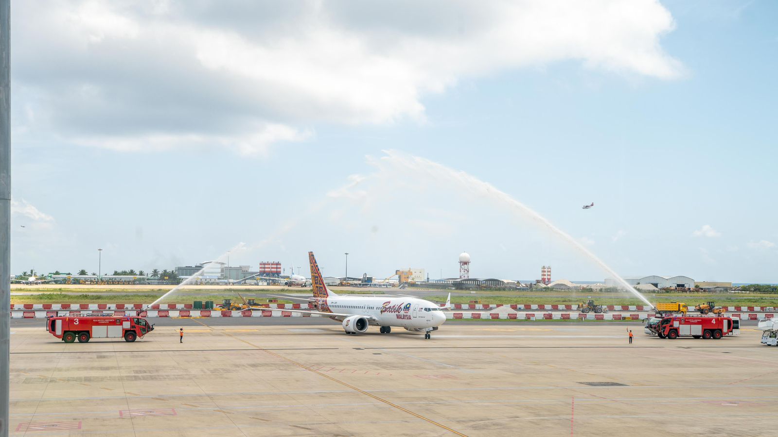 އަދި އާ ޓާމިނަލަށް ކައިރި ކުރި ބަޓިކް އެއާގެ ފުރަތަމަ މަތިންދާބޯޓު، އޯޑީ293-5 އަށާއި ބެންކޮކް އެއާވޭސްގެ ފުރަތަމަ މަތިންދާބޯޓު ޕީޖީ711-2 އަށް ވޯޓާ ސެލިއުޓް ދީ، އެ ފްލައިޓުން ރާއްޖެ އައި ފަސިންޖަރުންނަށް ވަނީ ސަގާފީ ހަރަކާތްތަކާ އެކު ހޫނު މަރުހަބާއެއް ކިޔައިފަ އެވެ.